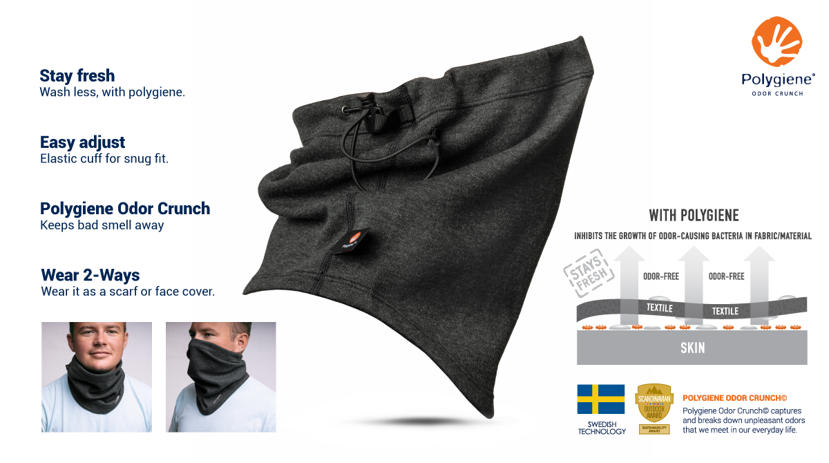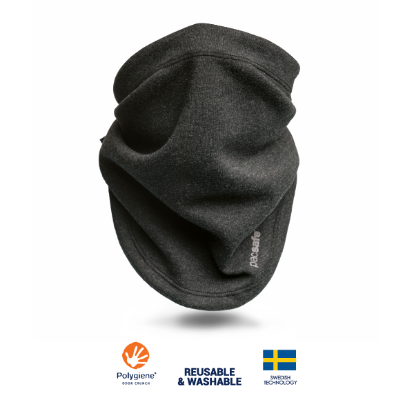 Enjoy the outdoors and keep your neck warm from the elements as a scarf, and protect yourself from unwanted dust and particles as a face cover. The Pacsafe Neck Gaiter is treated with Polygiene Stay Fresh and Polygiene Odor Crunch, to keep you and the neck gaiter free from smell and bacteria. Stay fresh, and wash less.