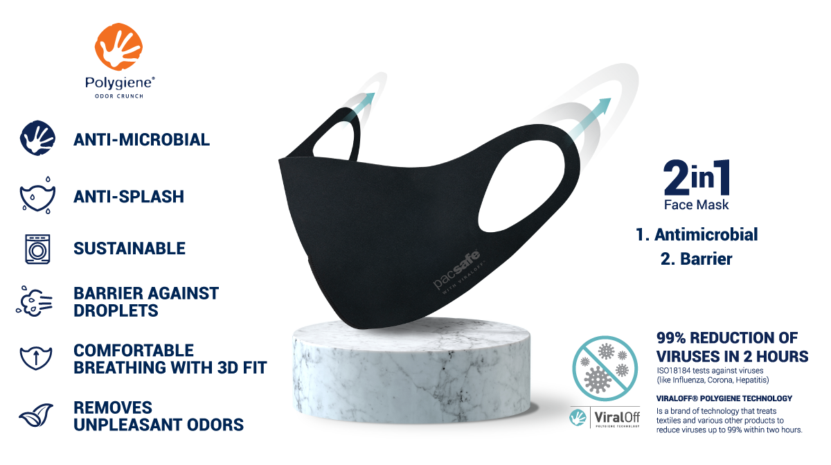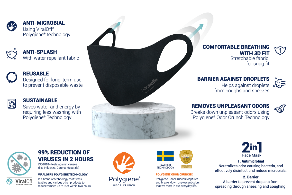 Using a mask is smart and considerate. But what if your mask builds up viruses? The Pacsafe ViralOff Face Mask treated with Polygiene® ViralOff® will hold 99% fewer viruses in 2 hours. Think of it as sanitizing gel for your mask.