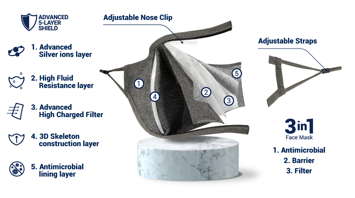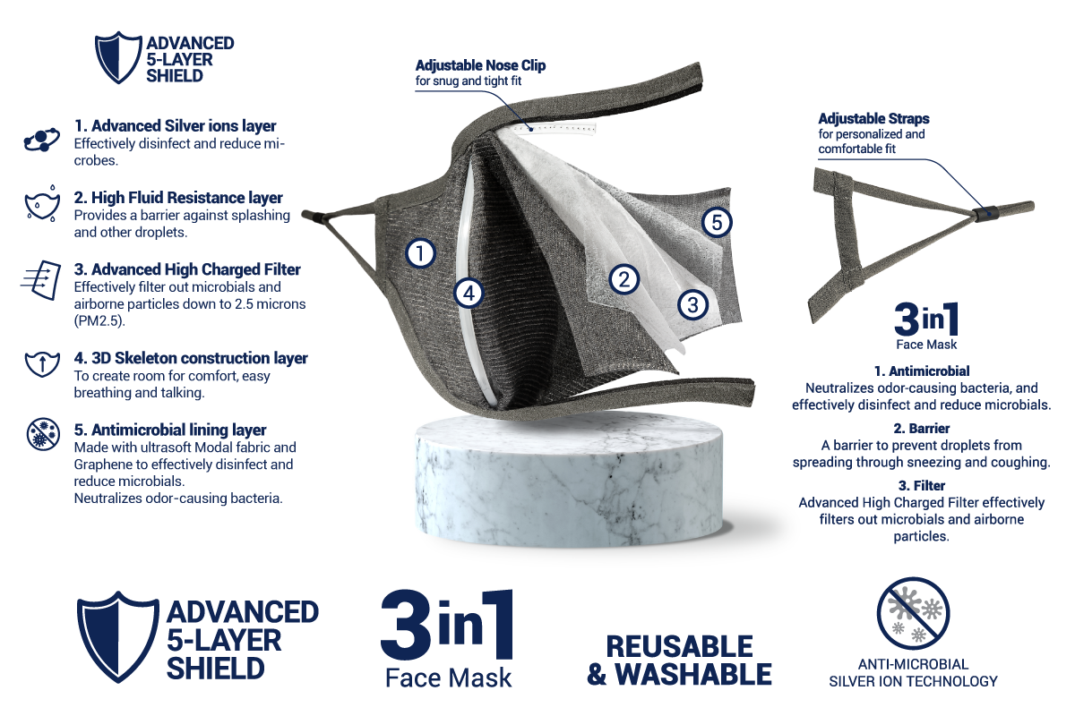 Pacsafe Silver ion Face Mask is a reusable and washable mask that provides at least 99% filtration efficiency against microbials and airborne particles. This mask is constructed with 5 different layers; each layer serves a specific function and ensures that the mask’s performance can be retained after washing. These functions include directly inactivating microorganisms through antimicrobial materials, and electrostatically adsorbing microorganisms and particles to benefit the user.