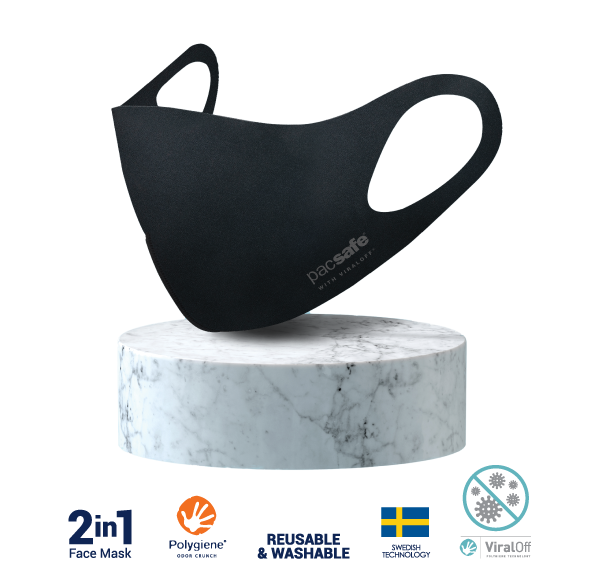 A stuffy airplane cabin, a fragrant market, or a busy train station, the travel situations where a face mask can come in handy are many. Using a mask can be a great travel accessory, and sometimes even a requirement by airlines. A Pacsafe face mask is your essential travel companion.