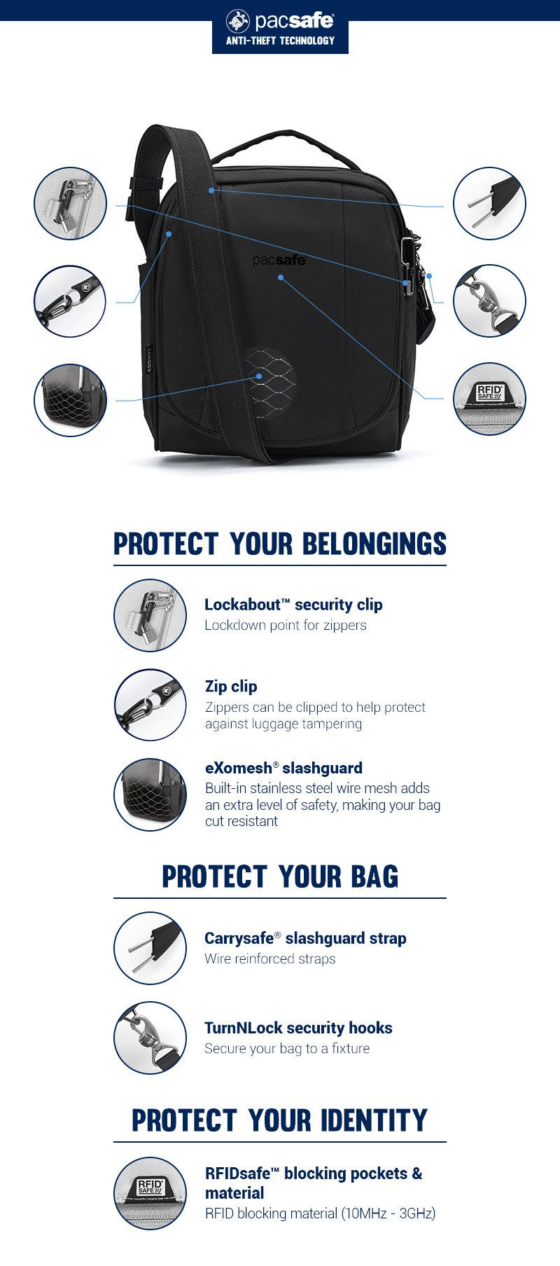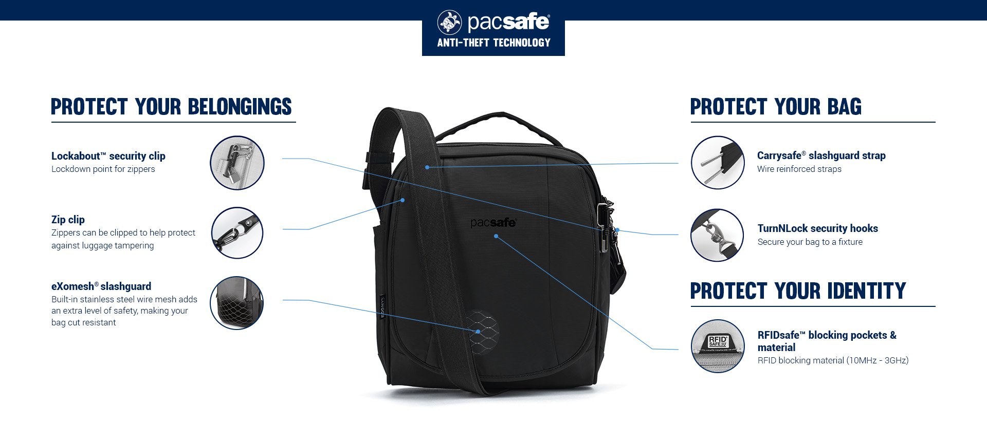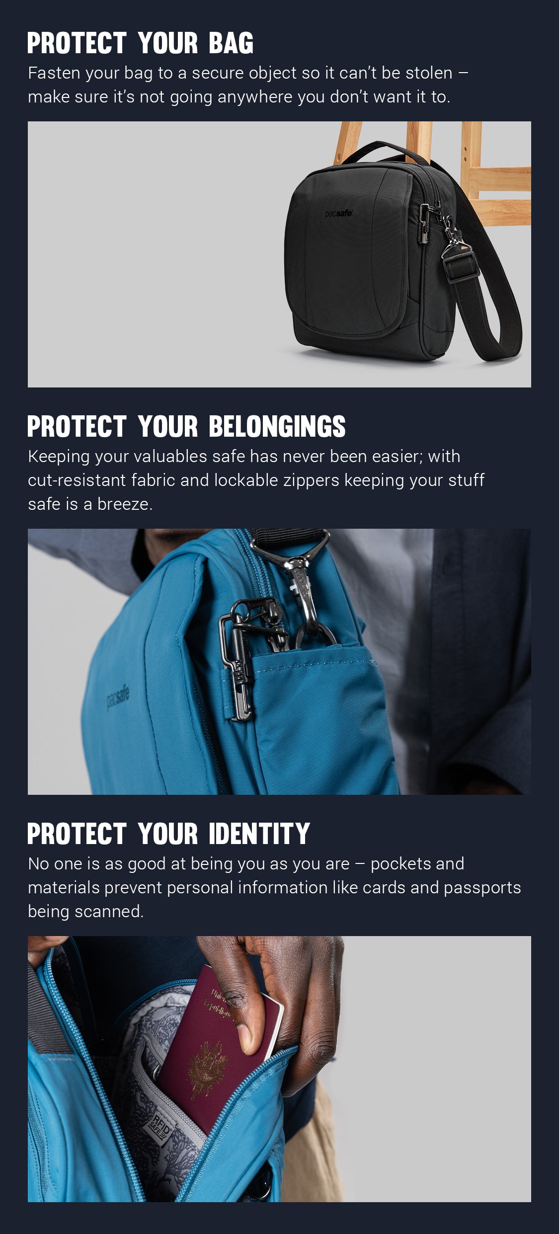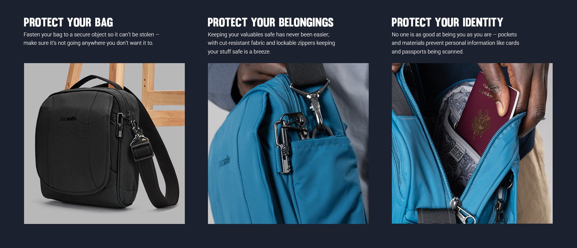 I would love to see Pacsafe create a unisex bag in the future with the following specs: 10 × 24 × 30 cm, a side zippered pocket for an umbrella or coffee mug, and water- and wear-resistant materials (very important!).