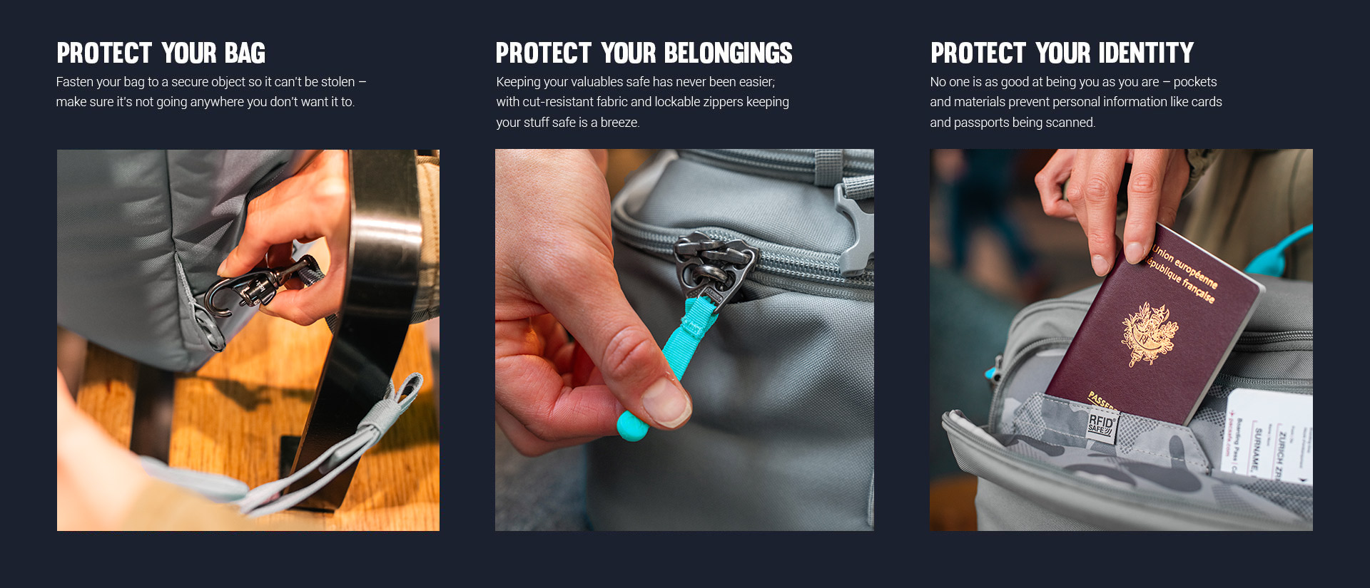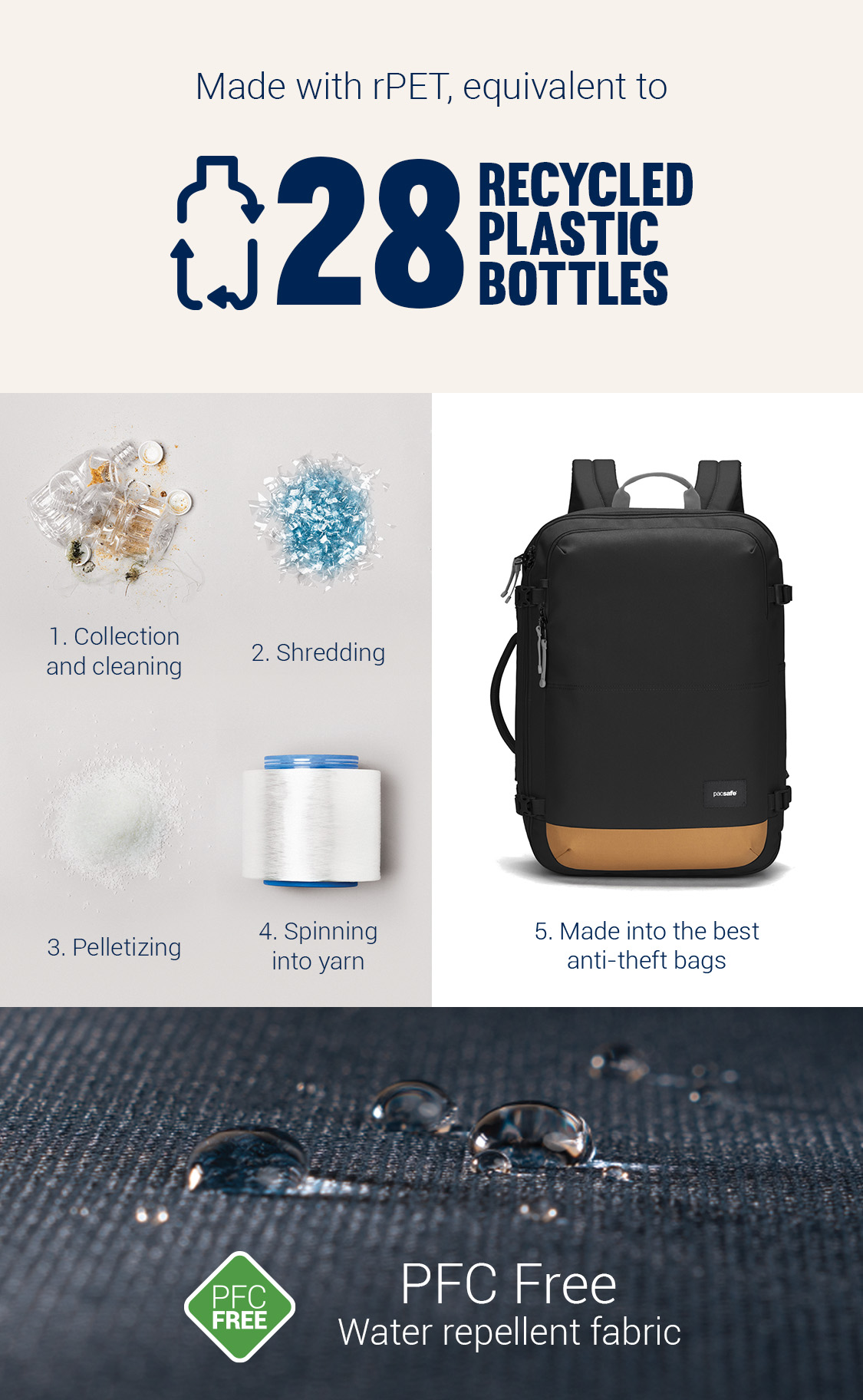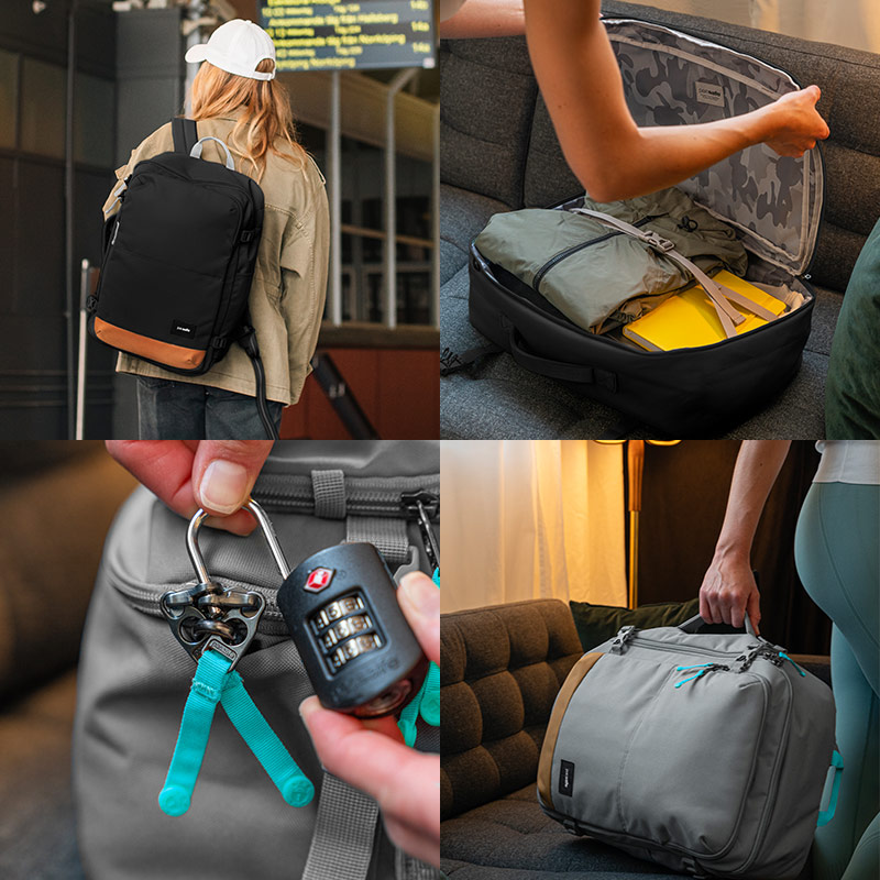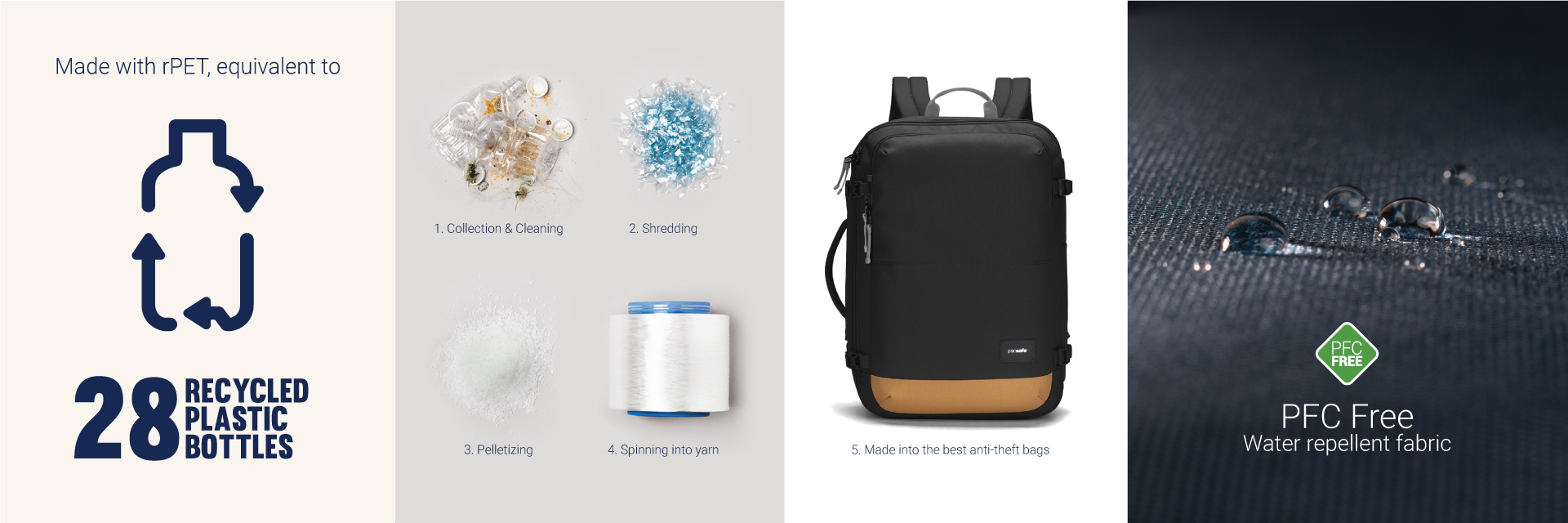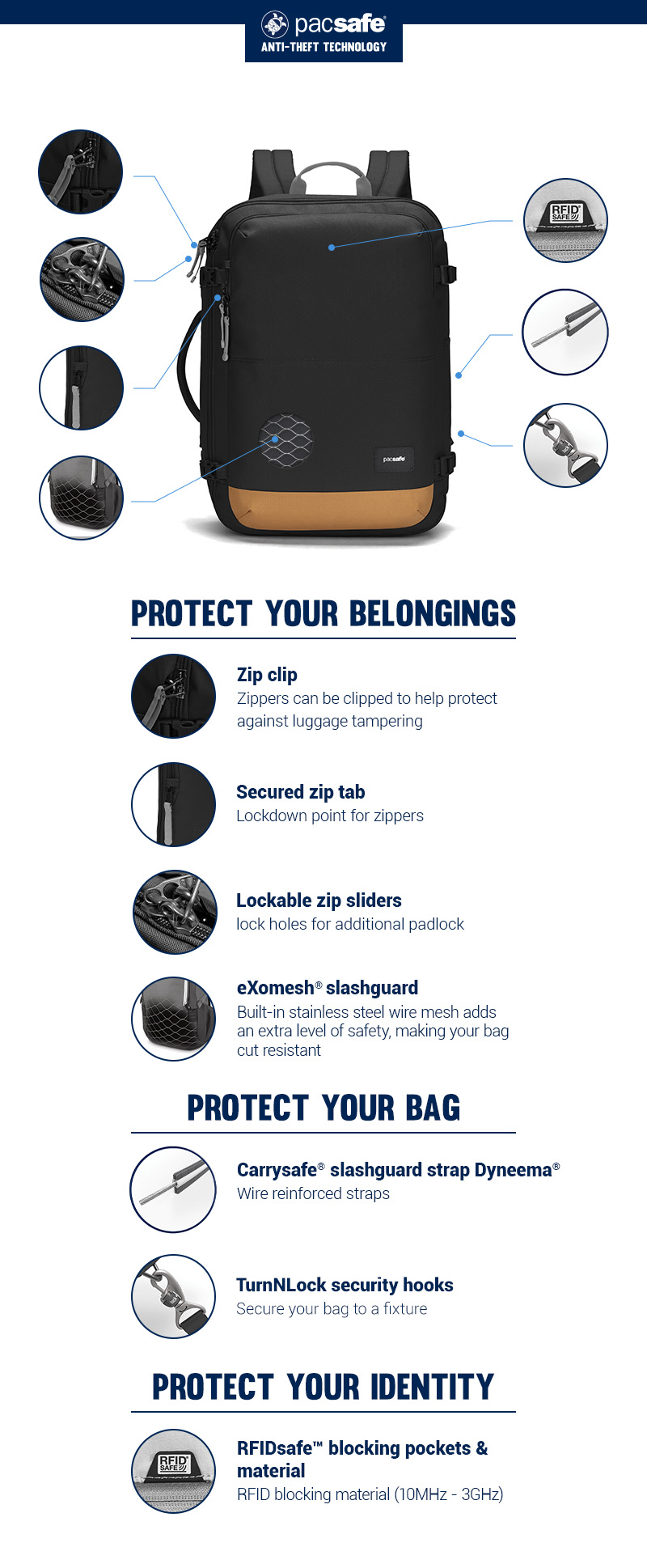 Great addition to our PacSafe bag collection! We needed a smaller backpack that offered a lot of room without traditional dividers. This bag is perfect for awkwardly shaped items you need to carry on, like size 15 men’s shoes, that don’t fit in a standard backpack well. Love the PacSafe products.