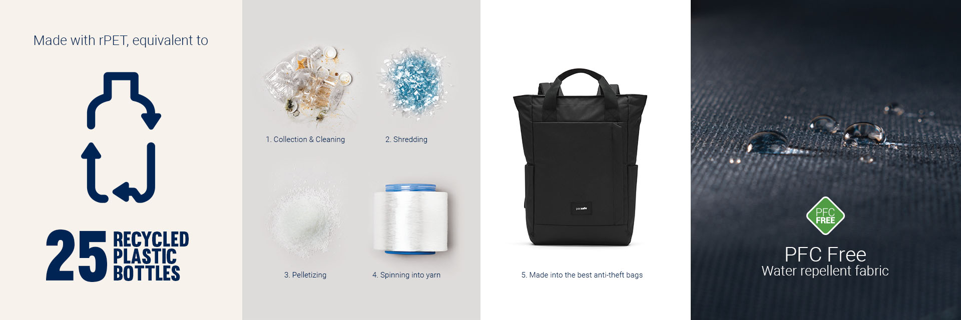 This product is made with post-consumer recycled polyester (rPET), equivalent to 25 recycled plastic bottles, and is treated with a 100% PFC-free water repellency.